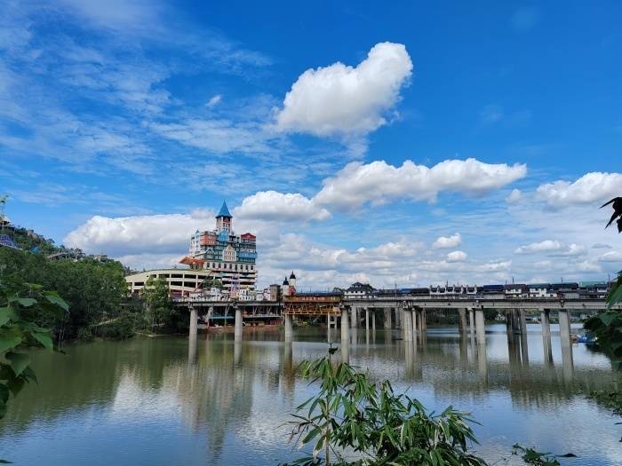 一场秋雨过后配资台,长江涪陵段天空放晴,澄澈蓝天与洁白流云相映成趣。三峡蓄水逼近175米的平湖碧波之上,美心红酒小镇的彩色酒店如童话城堡般矗立,在蓝天白云与绿水清波的映衬下更显灵动。