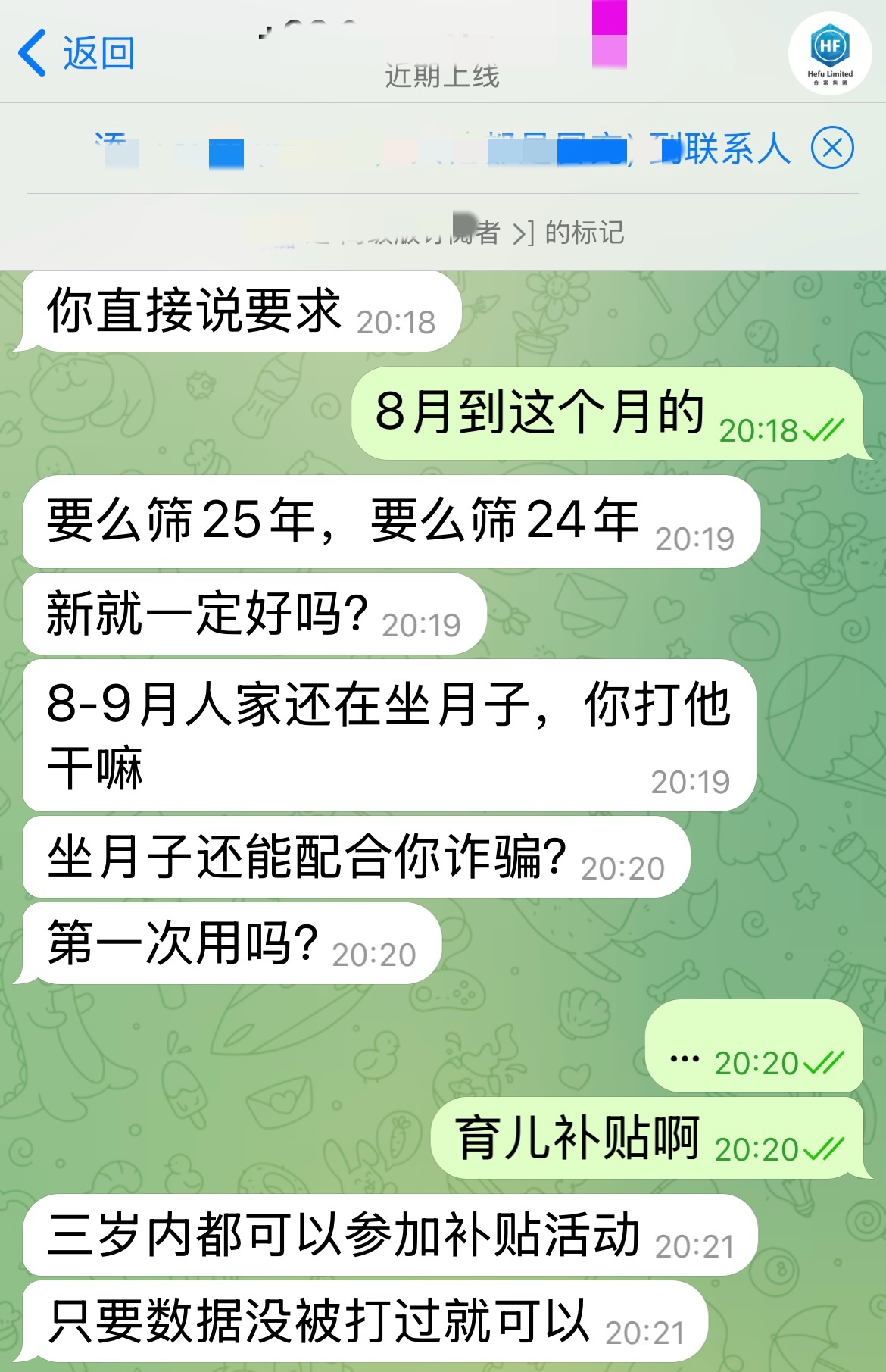 当记者询问是否有8月出生的数据,对方称“新不一定好”,随后表示“三岁内都可以参加补贴活动,只要数据没被打过就可以”,还发来与其他买家交易成功的截图。