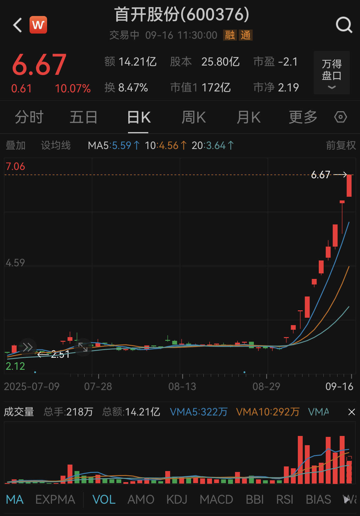 9月16日盛鹏智投,首开股份(600376.SH)再度涨停,录得10个交易日内的第9个涨停板,截至午盘报6.67元股。事实上,自9月3日以来,这家主营房地产开发的国有企业股价累计涨幅高达152.65%,累计换手率达到113.06%。