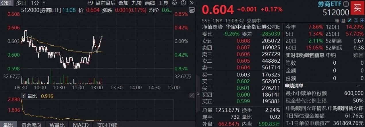9月16日,大盘短暂冲高后回落震荡,“旗手”早盘随市回调,后企稳向上,午后成功翻红元富证券,300亿顶流券商ETF(512000)场内价格现涨0.17%,早盘一度下跌0.83%,实时成交额超7亿元,交投活跃。